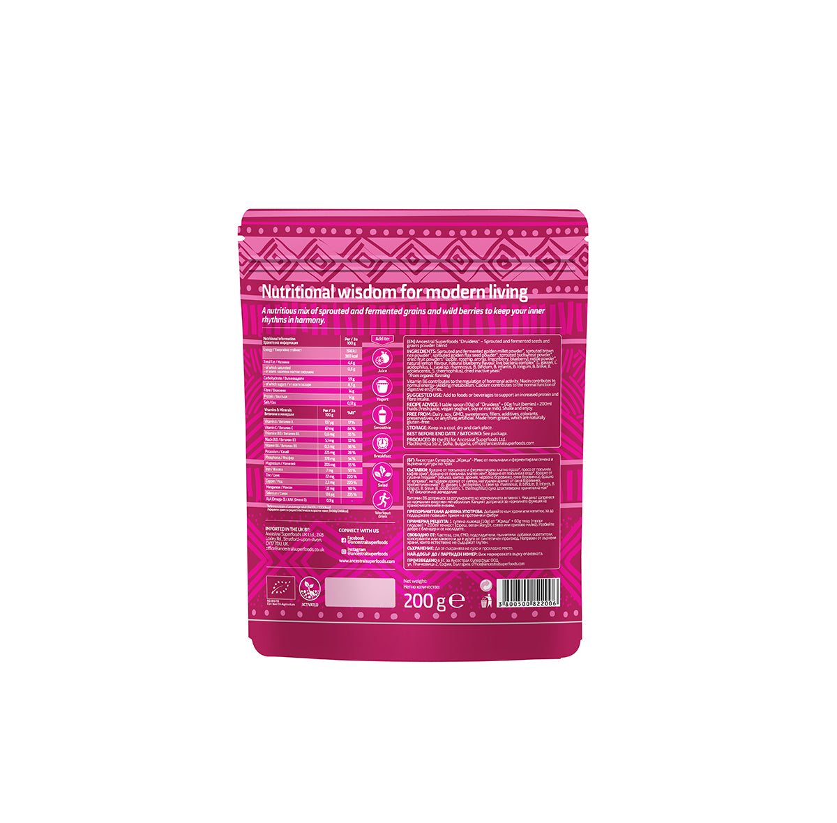 Sprouted golden millet*, sprouted brown rice*, sprouted buckwheat*, sprouted golden flax seeds*, dried fruit powder*: (rose hips, chokeberries, lingonberries and blueberries), nettle powder*, lemon extract*, probiotic complex*, dried inactive yeast*, erythritol*