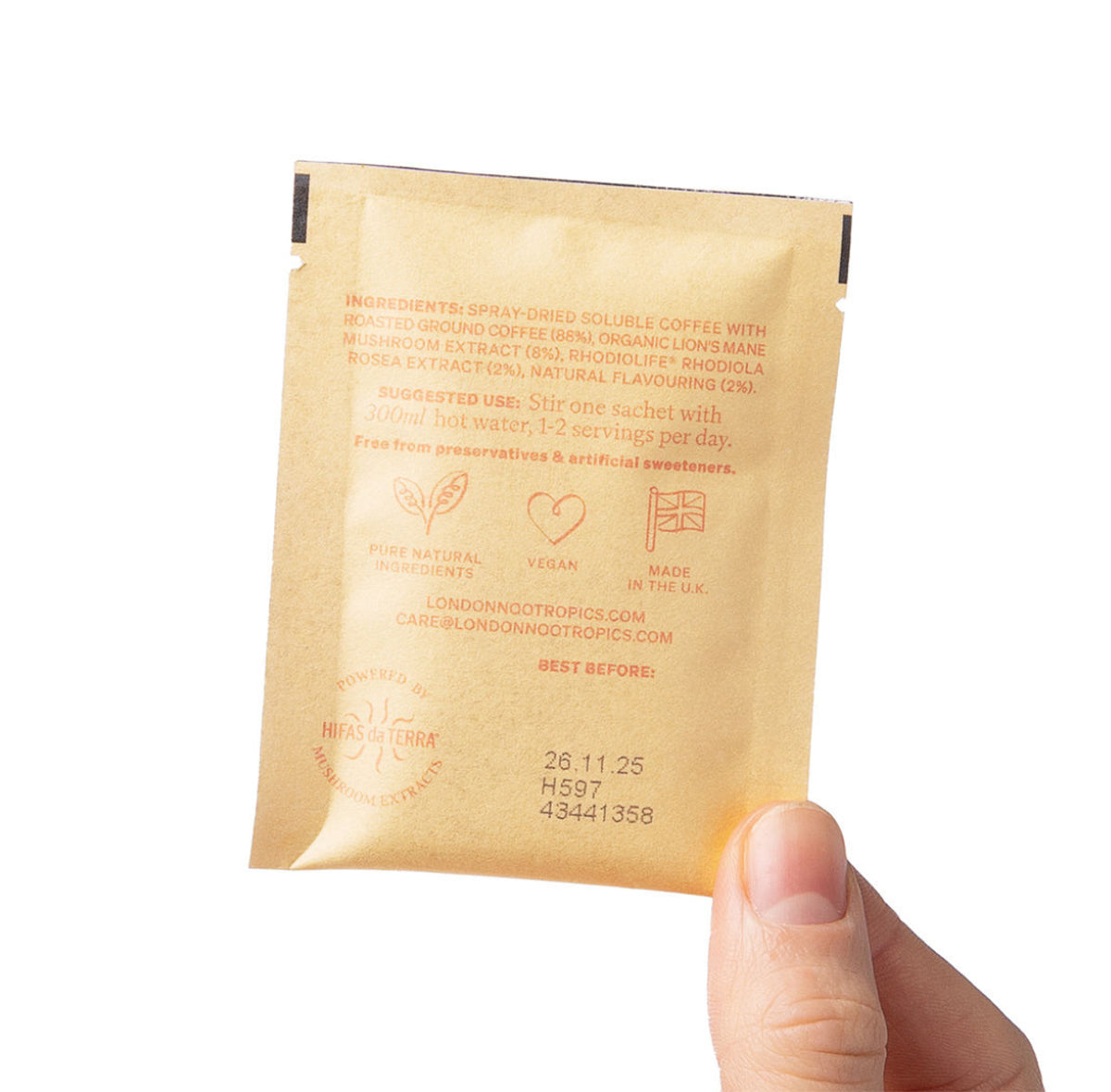 - Functional benefits – each sachet contains a clinically effective dose of Lion’s Mane and Rhodiola extracts.