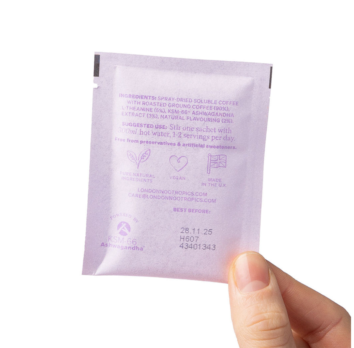 Instant coffee with 6% finely ground roasted coffee, L-theanine (153 mg), KSM-66 Ashwagandha® root extract (110 mg) with 5% withanolides, natural flavors